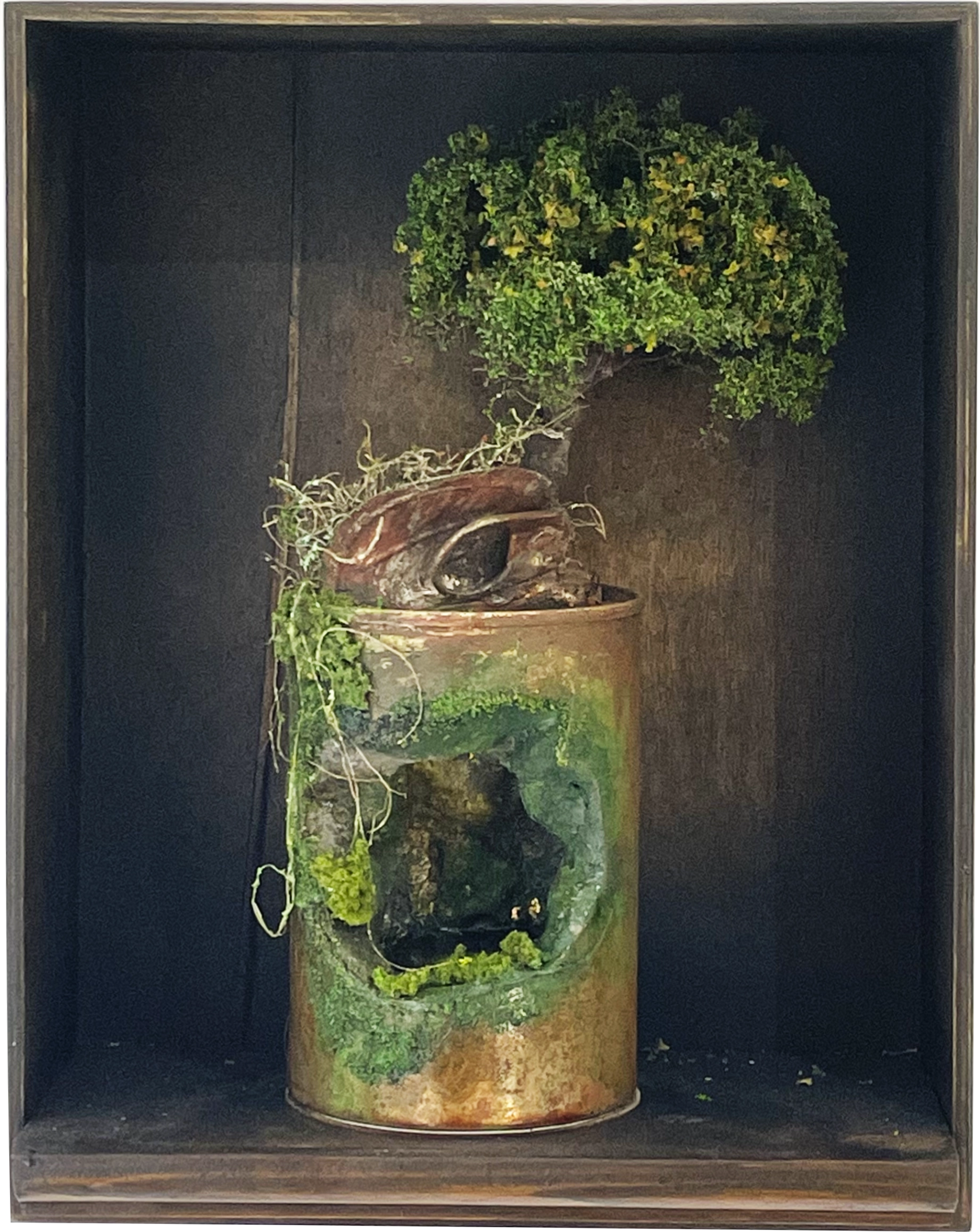 Each miniature diorama has been made in a tin can with a landscape scene on top and a cave underneath, light with a tea light build in to the base.
