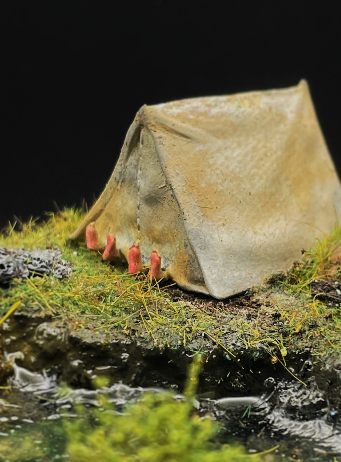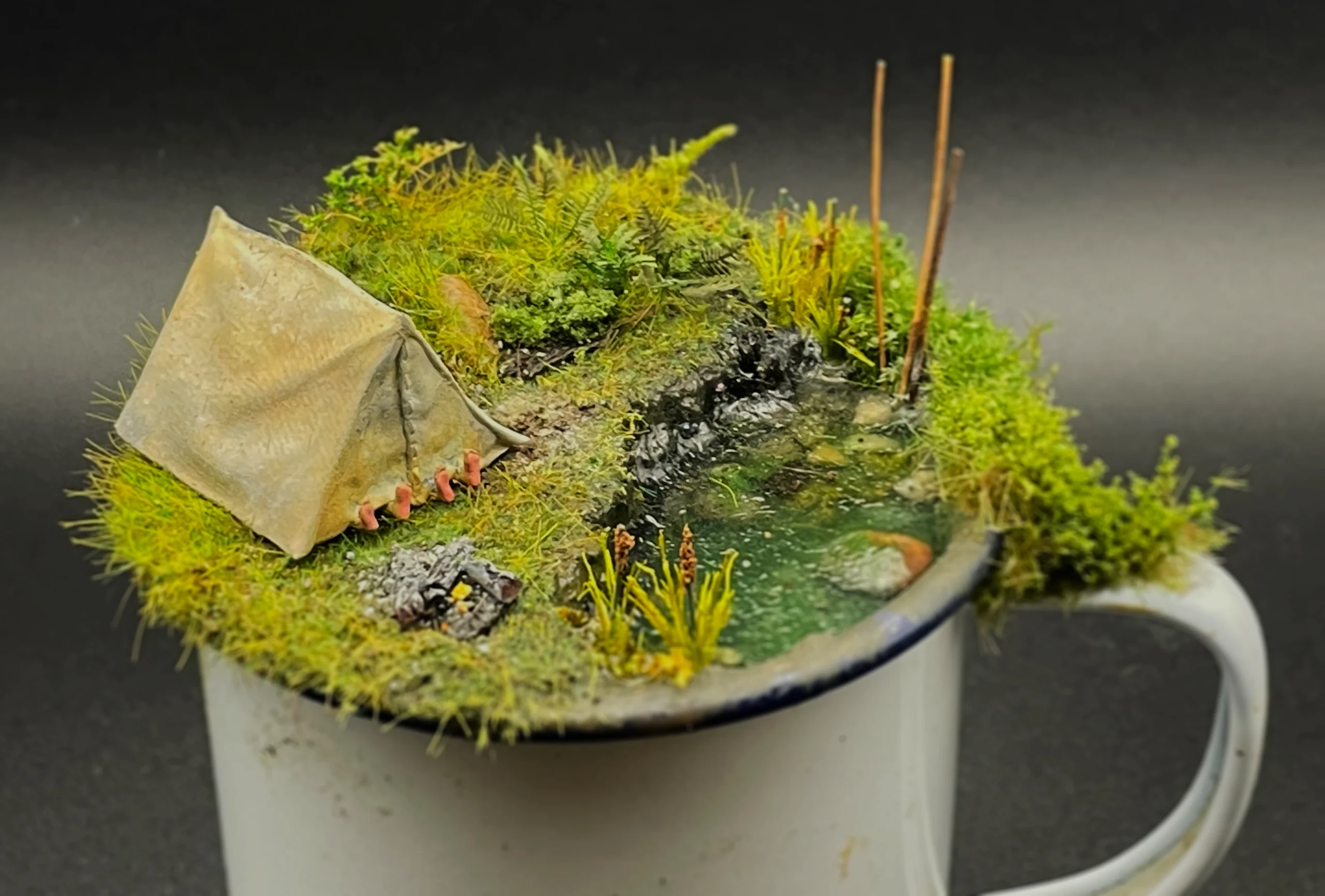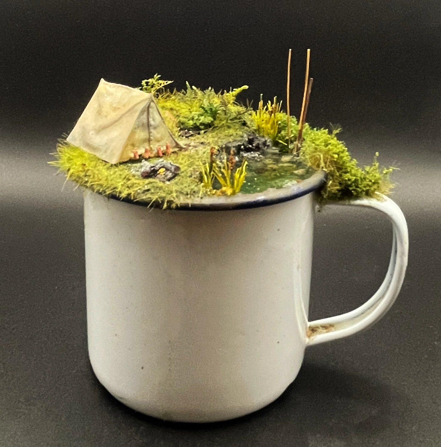 an old tin mug with a tent with two pairs of feet sticking out  beside a lake