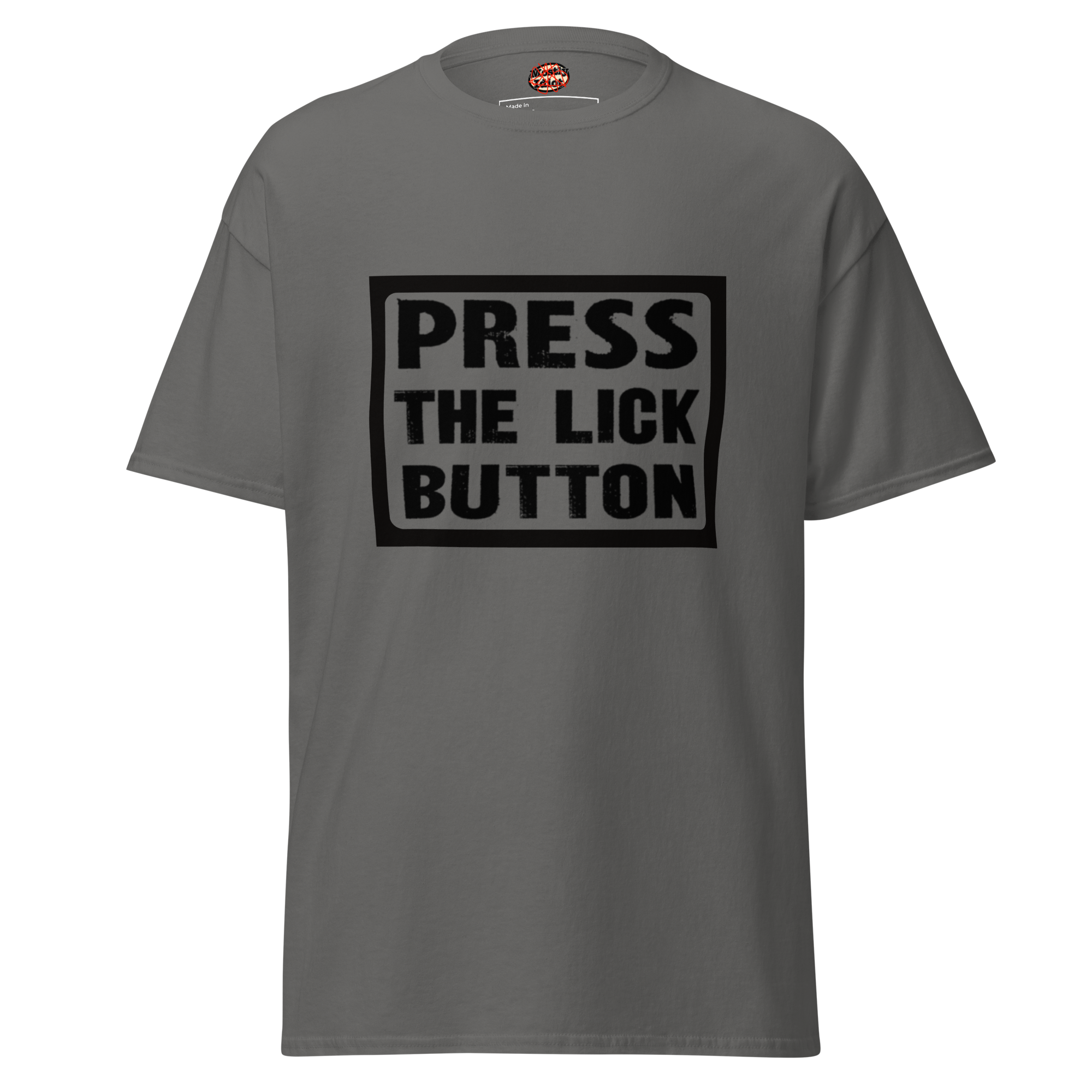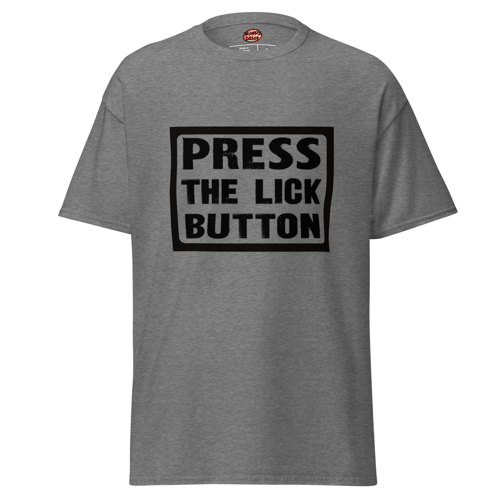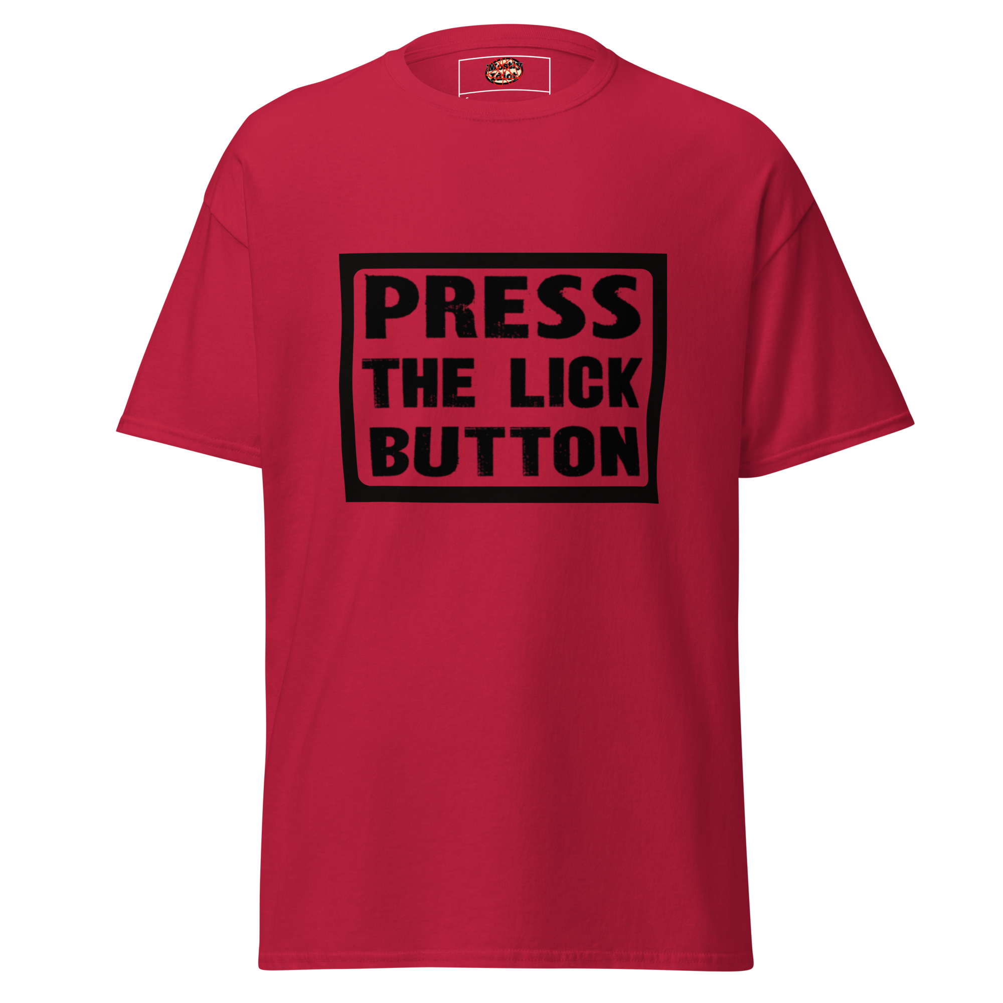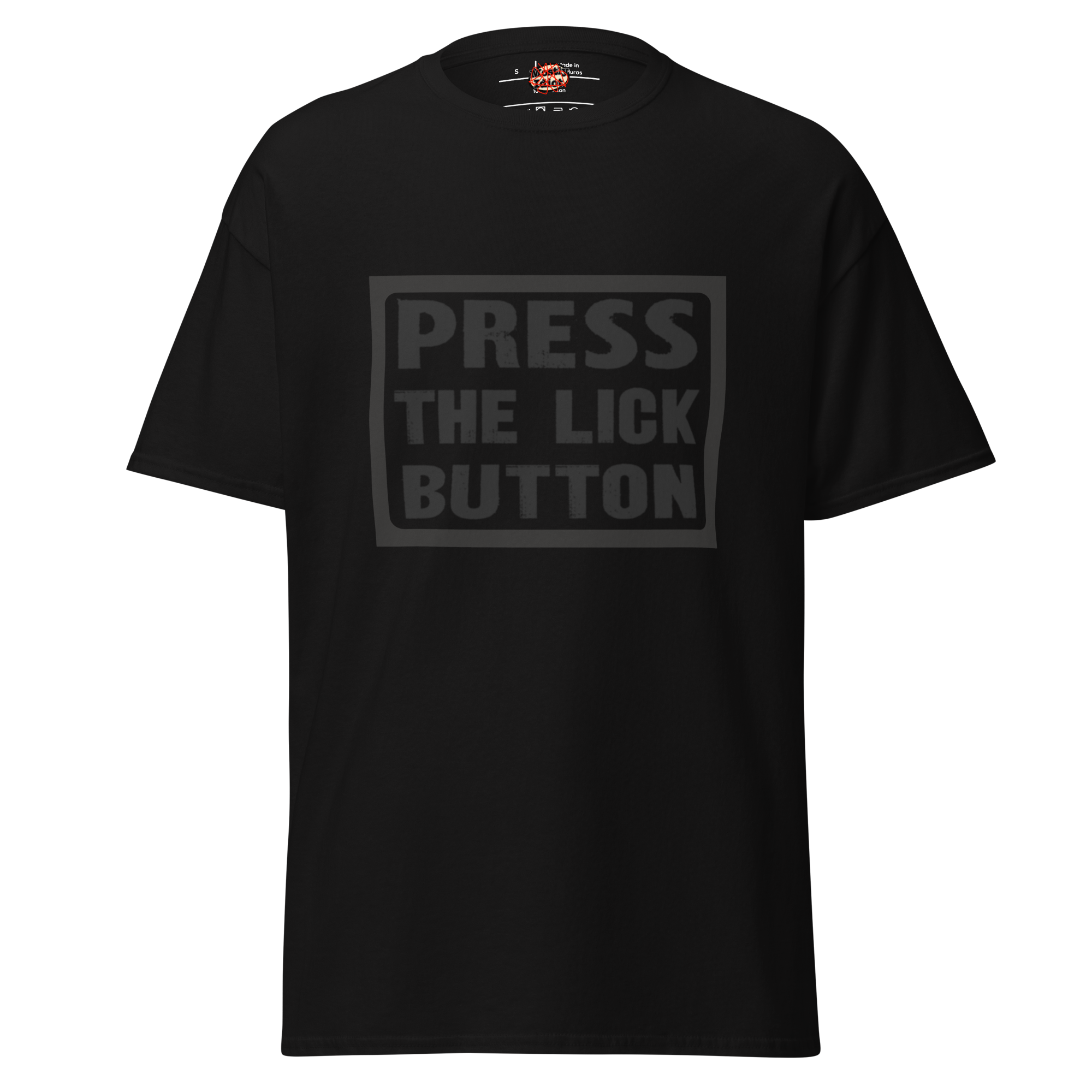 press the lick button tee black text